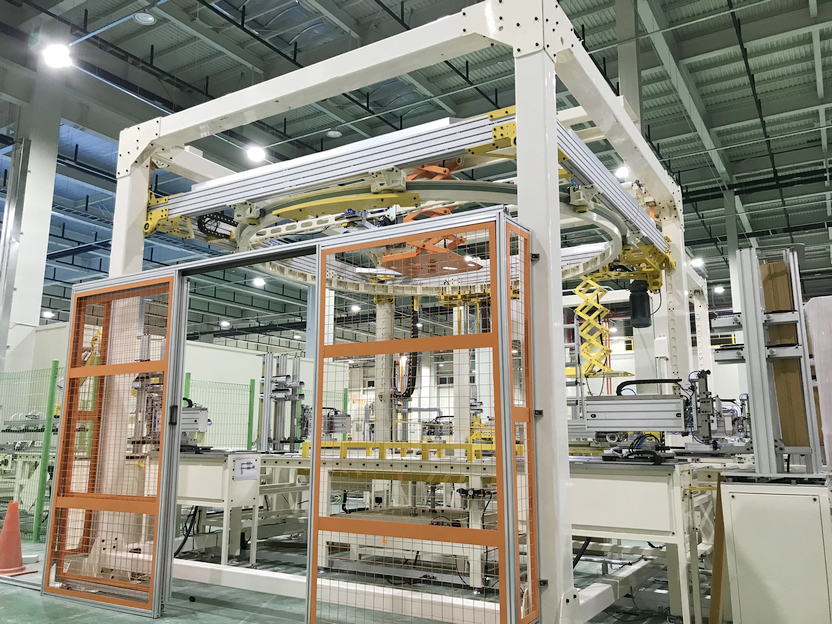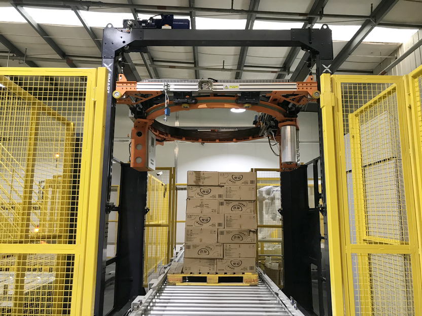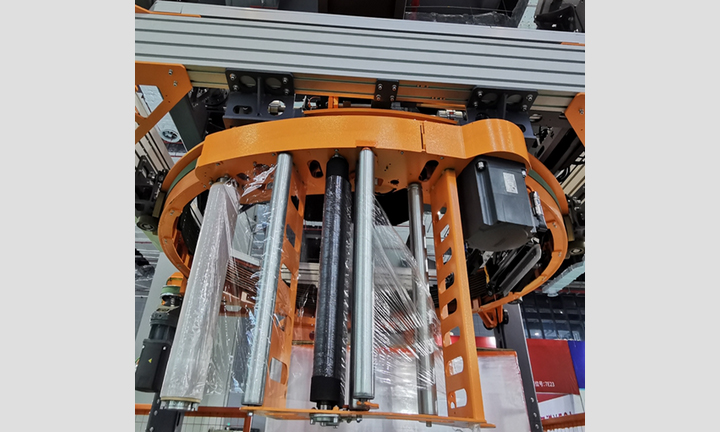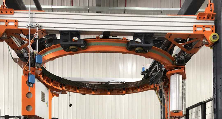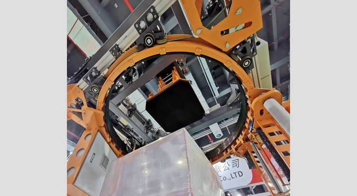 环式包装,在包装过程中,托盘避免坠落,环移动,托盘在传送带上,包装更平稳。