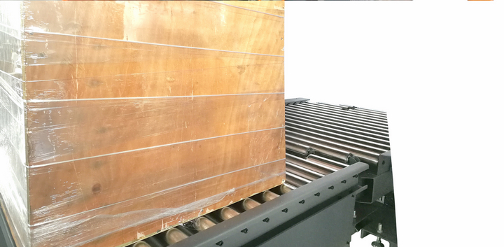 小黄蜂智能在线缠绕机采用89mm不锈钢输送滚筒,滚筒间距小,从而保证平稳输送托盘。